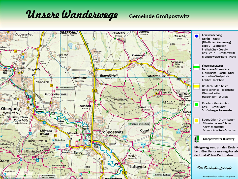 Der alte Kirchsteig über die „Almwiese“ am Sattel zwischen Drohmberg und Schmoritz soll heute weniger genommen werden (Wunsch des Landbesitzers), deshalb gehen wir links am Waldrand (gelber Punkt) weiter. Unten treffen wir auf den Siebenhügelweg (grüner Strich), der von Bautzen zum Bieleboh führt. Ein Stück gemeinsam führen uns nun die beiden Farbmarkierungen, wobei wir uns rechts halten.